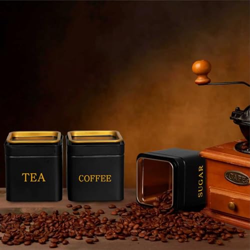 Yuecda 3-piece sugar bowl, tea caddy, and coffee caddy ensemble Black Stainless Steel Containers Airtight Metal Coffee Jar with Golden Lid for Home Food Storage Flour Spice Kitchen Decor Cafe Accessories